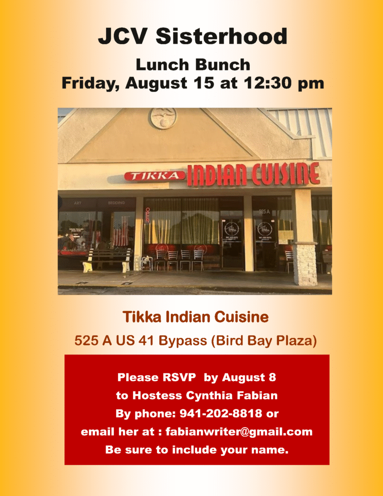 RSVP by August 8 to Cynthia Fabian at 941 202-8818 or fabianwriter@gmail.com. Be sure to include your name.
